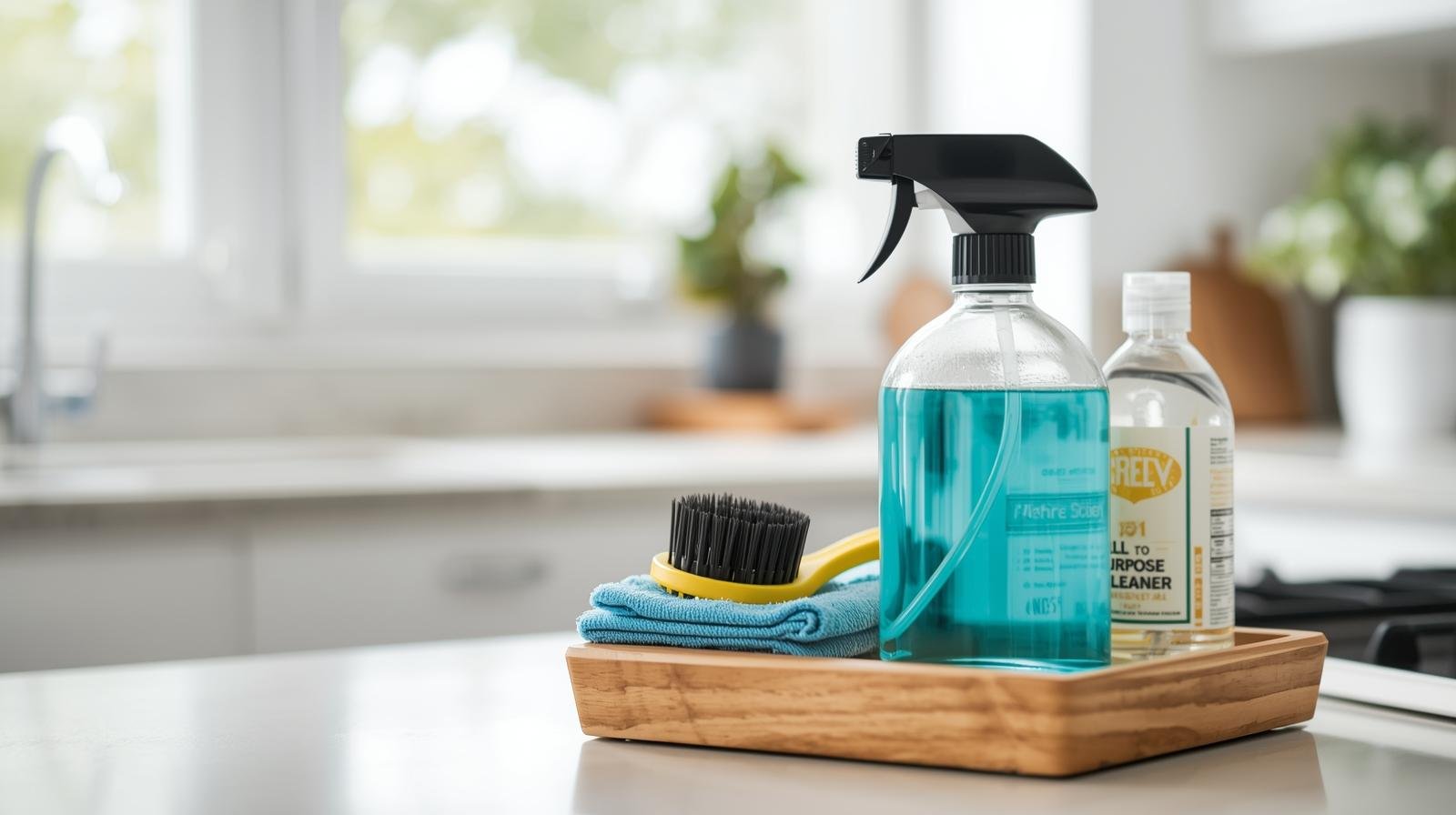 A multi-purpose cleaner is the backbone of your cleaning kit. It’s perfect for wiping kitchen counters, tabletops, tiles, and even bathroom surfaces.